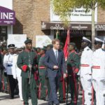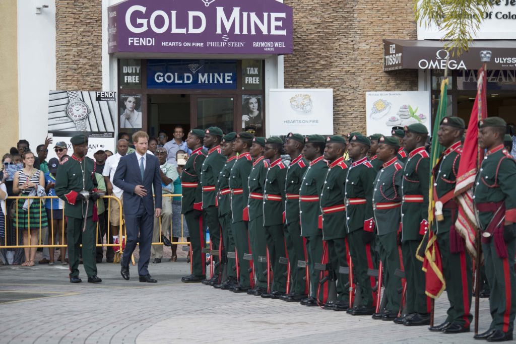 At Port Zante, Prince Harry smiled graciously as his arrival at the cruise pier was met with cheers and applause of several spectators who had gathered. Accompanied by St. Kitts and Nevis’ Governor General, His Excellency Sir S. W. Tapley Seaton, Prince Harry stood at the Saluting Dias to be given a royal salute by representatives of the Royal St. Christopher and Nevis Police Force and the St. Kitts-Nevis Defence Force and its Coast Guard Unit that made up a Guard of Honour.