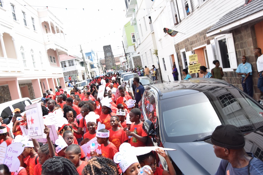 Basseterre, St. Kitts, July 14, 2017 (SKNIS): More than 500 children filled the streets of the capital city Basseterre on Friday (July 14) as they proudly displayed signs, head dresses and t-shirts that promoted safety tips learnt during the Summer Safety Programme.