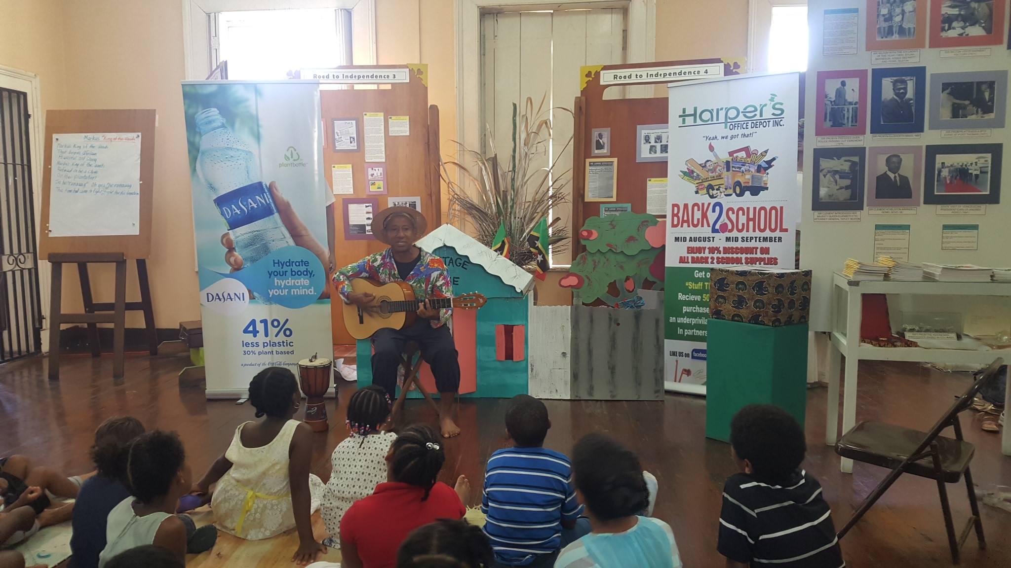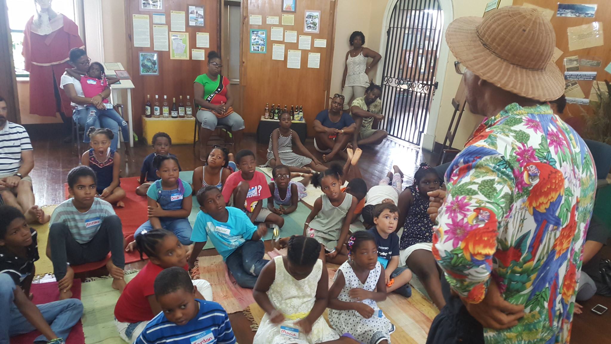 (St. Christopher National Trust) St. Kitts and Nevis – August 28, 2017: The sound of children’s voices raised in song filled the air at the National Museum on Saturday morning (August 26th) as the curtains came down on its Dasani-Harper’s heritage House Storytelling Series. Musician, composer, poet and performance artist Creighton “Papa George” Pencheon regaled the children with the tale of Markus King of the Woods, an African enslaved man who escaped captivity from Cunningham Estate in the 19th century.