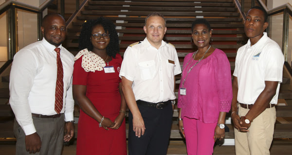 | Permanent Secretary in the Ministry of Tourism, Mrs Carleen Henry-Morton and Chairman of the Board of Directors of the St. Kitts Tourism Authority, led a delegation of stakeholders on board the ship to officially welcome the captain, crew and passengers to St. Kitts.
