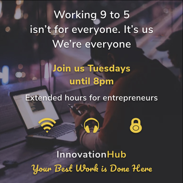 Are you looking for a comfortable space with reliable WiFi? Find it all, for free, at InnovationHub. We’ve extended our hours on Tuesdays and are open to serve you until 8pm (close at 4pm on other days).