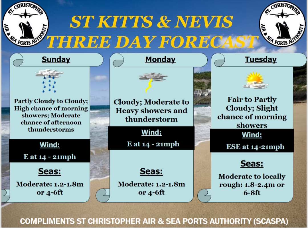 Weather Forecast for St. Kitts & Nevis: Instability from the passage of a tropical wave will gradually reduce today and will cause a more stable atmosphere to return over the Leewards by this afternoon; however later tonight and into tomorrow, a fast moving tropical wave will increase the chance of