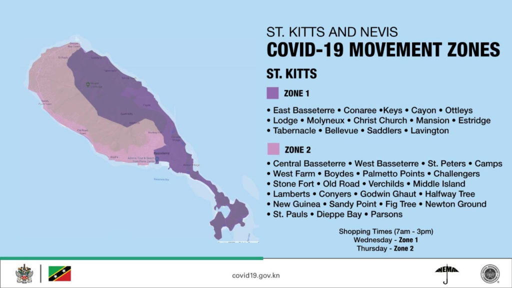 Today, Wednesday, persons living in Zone One (classified as the East Side in St. Kitts) and in Zone Three (the parishes of St. Pauls, St. Thomas and St. James in Nevis) were allowed to shop for essential items at supermarkets, pharmacies and food retail shops in the major town centres.