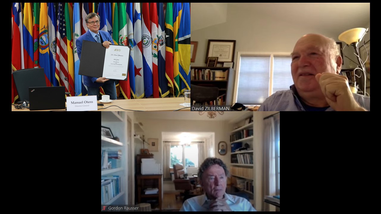 | San Jose, 15 November 2021 (IICA). Economist and University of California at Berkeley professor David Zilberman, a leading voice on building the concept of the bioeconomy as a vision for development, was awarded the title of “IICA Chair in Bioeconomy and Sustainable Development”.In a virtual ceremony, Manuel Otero, Director General of the Inter-American Institute for Cooperation on Agriculture (IICA), bestowed the title on Zilberman, author of countless books on alternative energies and, in particular, on biofuels as the basis of a new energy matrix that is better aligned with the environmental concerns of our time.Gordon Rausser, internationally acclaimed economist and specialist in agriculture and Distinguished Professor Emeritus at UC Berkeley; Beverly Best, Director of External and Institutional Relations at IICA; and Jorge Werthein, Special Advisor to the Director General of IICA, also participated in the ceremony.Zilberman is a professor in the Agricultural and Resource Economics Department at UC Berkeley. His areas of expertise include agricultural and environmental policy, the economics of innovation, biotechnology and climate change.From his position at the university, he has advocated for the bioeconomy as a source of opportunity to leverage the development of the rural areas of the Americas and accelerate post-COVID-19 economic reactivation.The bioeconomy is a vision that promotes smart industrialization using biological resources, which are converted into value-added products, such as bioproducts, bioenergy and services. It also seeks to tackle existing environmental challenges by mitigating the effects of climate change and reducing the use of fossil fuels.“I am very honored by this recognition. When I visited IICA for the first time 20 years ago for a debate on climate change, I admired the Institute’s vision and thought that one day I’d like to be a part of it”, expressed Zilberman.The academic explained that today agriculture faces a number of simultaneous challenges, such as dealing with climate change, ensuring food security, improving crop quality and being a source of income for millions of small-scale farmers, and believes that IICA’s cooperation makes an important contribution to confronting them.Zilberman maintained that organic agriculture can play only a limited role, as it is unable to produce food that is accessible to everyone. Instead, he stated the need to increase productivity through the tools of biology, which are also capable of preserving natural resources and confronting the effects of climate change.“We must make the transition to renewable energies and stop depending on fossil fuels. Biology has an incredible capacity to generate resources and we must expand our knowledge. Soils can produce food, chemicals and biofuels; this is especially true in the Americas, with its unique environment”, he added.Zilberman recommended promoting public-private investment, building capacities and attracting investment in order for the continent to leverage the full potential of its biological resources.For his part, Gordon Rausser, a prestigious colleague of Zilberman’s, summarized Zilberman’s myriad academic achievements, starting in 1979 when he completed his doctorate.“His many achievements include being the first economist to receive the Wolf Prize in Agriculture in 2019”, stated Rausser. The Wolf Prize is considered the equivalent of a Nobel Prize in agricultural research and development.Rausser shared that he has known Zilberman for 40 years and praised his versatility in making significant contributions to a number of disciplines, his participation in different associations and his predisposition to accompany students who are just starting their careers. “His work has benefitted us all. He couldn’t be a better colleague and friend”, he concluded.Beverly Best expressed that Zilberman is a new member of the IICA family and explained that the “IICA Chair” Program was created in 2018 with the mission to provide technical cooperation of excellence focused on generating knowledge that will transform agriculture and contribute to rural development in the Americas.“The program is intended to improve the visibility of innovative ideas, build the capacities of stakeholders in the public and private sectors and facilitate the exchange of knowledge and experiences”, she added.In turn, Otero explained that over the last few years, IICA has seen direct proof of the magnitude of Zilberman’s contributions and his personal attributes.“Together, we have developed various activities that have significantly contributed to the development of the bioeconomy in our region. I’m referring specifically to Dr. Zilberman’s participation in a series of academic-political dialogues that we organized during the COVID-19 pandemic, as well as our joint preparation of the document ‘Potential of the Bioeconomy to Transform Food Systems’, through which we contributed to the work of the Scientific Group established within the framework of the recent United Nations Food Systems Summit”.Otero mentioned that prior to Zilberman, other IICA Chair recipients are Elizabeth Hodson, Professor Emeritus at Pontificia Universidad Javeriana; Rattan Lal, Professor of Soil Science and Director of the Center for Carbon Management and Sequestration at Ohio State University; Roberto Rodrigues, former Minister of Agriculture of Brazil, Coordinator of the Agribusiness Studies Center at Getúlio Vargas Foundation and Professor of Agribusiness at the Luiz de Queiroz School of Agriculture at the University of Sao Paulo; and the Agricultural Plant Physiology and Ecology Research Institute (IFEVA) of the School of Agronomy at the University of Buenos Aires, Argentina. |