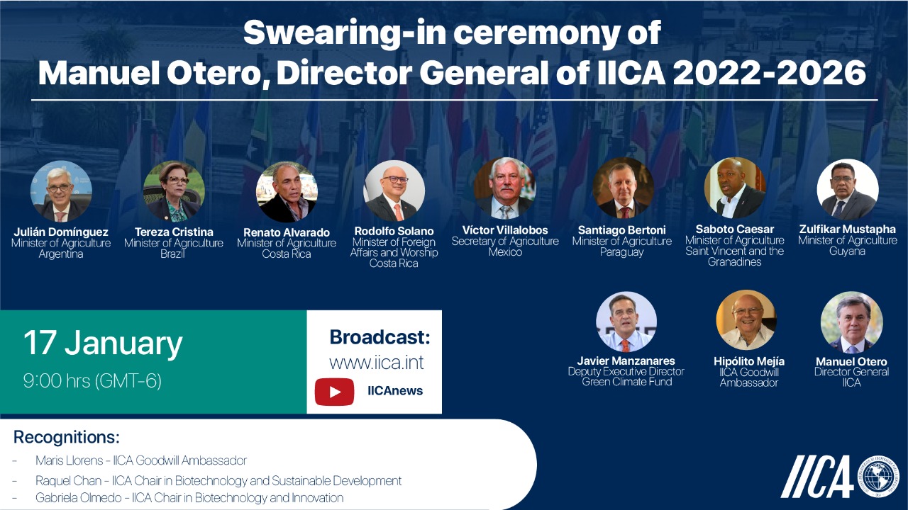 | San Jose, 14 January 2022 (IICA). Argentinean veterinarian Manuel Otero will officially begin his second term as head of the Inter-American Institute for Cooperation on Agriculture (IICA) on Monday, January 17, during an event that will be attended virtually by ministers of Agriculture of Latin America and the Caribbean and international officials. An unprecedented dialogue with Africa, on agricultural and rural development issues, will also be carried out. Julián Domínguez, Minister of Agriculture, Livestock and Fisheries of Argentina; Tereza Cristina, Minister of Agriculture, Livestock and Food Supply of Brazil, and Chair of the Inter-American Board of Agriculture (IABA), IICA’s highest governing body; Mustapha Zulfikar, Minister of Agriculture of Guyana; Víctor Villalobos, Secretary of Agriculture and Rural Development of Mexico; Santiago Bertoni, Minister of Agriculture and Livestock of Paraguay; and Saboto Caesar, Minister of Agriculture, Forestry, Fisheries, Rural Transformation, Industry and Labor of Saint Vincent and the Grenadines, will participate in the ceremony. Also in attendance virtually will be Javier Manzanares, Deputy Executive Director of the Green Climate Fund, and Hipólito Mejía, former President and former Minister of Agriculture of the Dominican Republic, who is also an IICA Goodwill Ambassador. The ministers of Foreign Affairs and of Agriculture and Livestock of Costa Rica, Rodolfo Solano and Renato Alvarado, respectively, will be present as special guests at the ceremony at the Institute’s headquarters, which will comply with all biosafety regulations. The ceremony will take place at 9:00 a.m. Costa Rica time (GMT-6). Within the framework of the swearing-in ceremony, awards will be presented to Maris Llorens, a Swiss-born livestock businesswoman and philanthropist who became a naturalized citizen of Paraguay; and to Argentinean biochemist Raquel Chan and Mexican researcher Gabriela Olmedo. Manuel Otero was re-elected as Director General of IICA on September 1, 2021 by the IABA, a governing body comprised of the ministers and secretaries of Agriculture of IICA’s 34 member countries. His continuity in the position, which he first assumed in 2018, until 2021, was proposed by the Ministry of Foreign Affairs of Argentina last year and approved by the rest of the American countries. The Argentinean veterinarian was subsequently re-elected by acclamation during the Conference of Ministers of Agriculture of the Americas 2021, in recognition of his innovative management. “I am committed to strengthening IICA as the organization that provides first-class technical cooperation in service to the countries, and am confident that the future of our people depends on sustainable agricultural transformation”, stated Otero, who holds a Master of Science degree in Agricultural Development from the University of London and a Master’s degree in Animal Production from the Tropical Agricultural Research and Higher Education Center (CATIE). As part of the activities associated with the event, the First High-level Roundtable between Africa and the Americas: “Building Bridges for Future Cooperation in Agrifood Systems” will be held on January 18 at 8:00 a.m.Costa Rica time (GMT-6). This meeting will bring together ministers of Agriculture from Africa and Latin America and the Caribbean to explore practical options for generating South-South and international cooperation between African countries and countries of the Americas in matters related to the transformation of rural areas and agrifood systems. Agnes Kalibata and the former Prime Minister of Ethiopia, Hailemariam Dessalegn, will also participate, representing the Alliance for a Green Revolution in Africa (AGRA), which is organizing the event together with IICA. The swearing-in ceremony will be broadcast live on Facebook Live IICAnoticias (Spanish) and IICA’s official YouTube channels in English (@IICAnews), Portuguese (@IICAnoticiaspt) and French (@IICA Learning). |