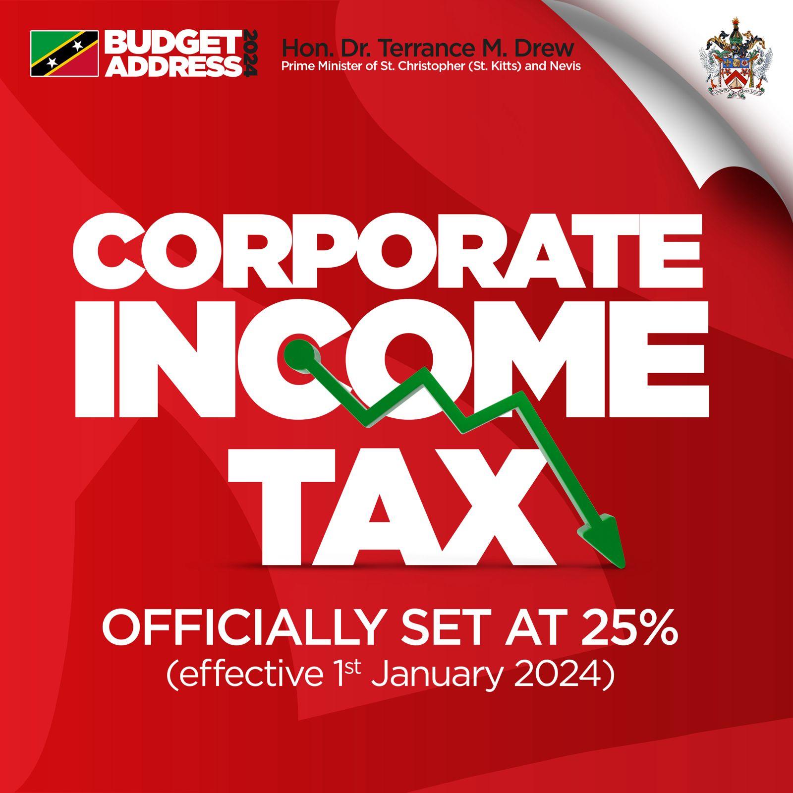 Basseterre, St. Kitts, December 13, 2023 (SKNIS): In a significant move to boost economic growth and business development, Prime Minister of St. Kitts and Nevis, the Honourable Dr. Terrance Drew, announced during his 2024 Budget Address in the National Assembly on December 13, 2023, that the Corporate Income Tax rate for corporations registered in the Federation will be officially set at 25 percent effective January 01, 2024.