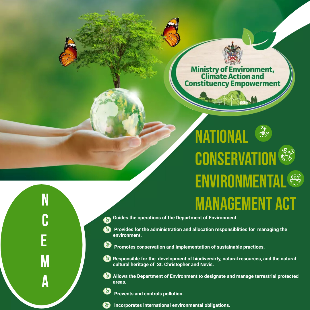This Bill, last updated in 1987 as the National Conservation and Environment Protection Act (NCEPA), is a long-standing comprehensive legislation that guides the operations of the Department of Environment. It aims to provide for the administration and allocation of responsibilities for managing the environment, conserving biological diversity and natural resources, and promoting the sustainable development of St. Christopher and Nevis’s natural and cultural heritage.