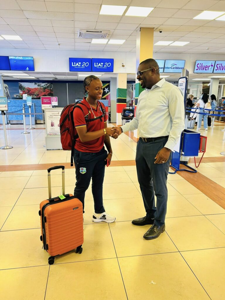 Jahzara Claxton left the Federation on Wednesday, May 14, to join the women’s team. Minister of Sports, the Honourable Samal Duggins travelled to the R. L. Bradshaw International Airport to wish her well and pledged continued support from the Government and people of Saint Kitts and Nevis.